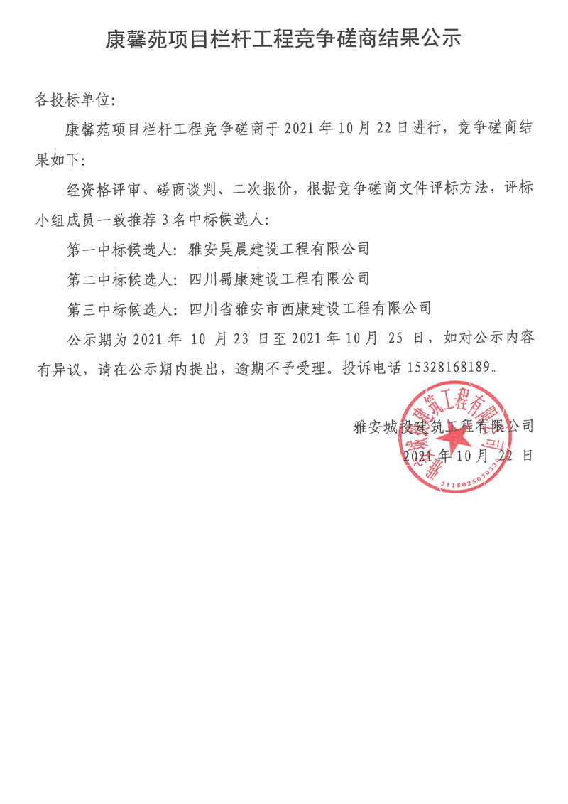 康馨苑項目欄桿工程競爭磋商結(jié)果公示