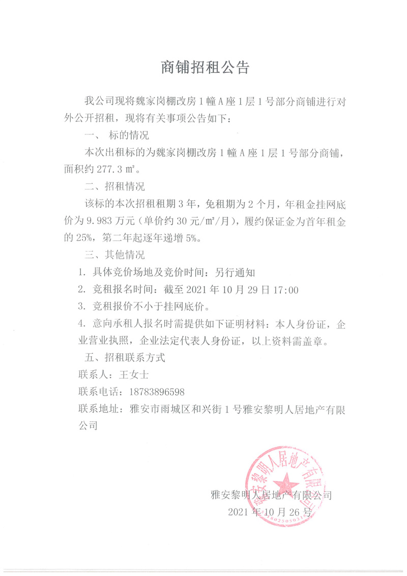 魏家崗棚改房1幢A座1層1號(hào)部分商鋪招租公告