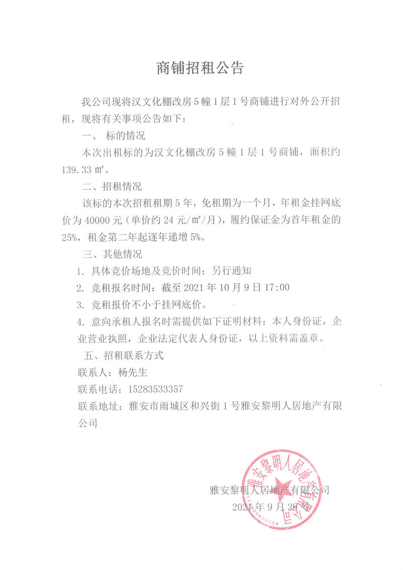 漢文化棚改房5幢1層1號(hào)商鋪招租公告