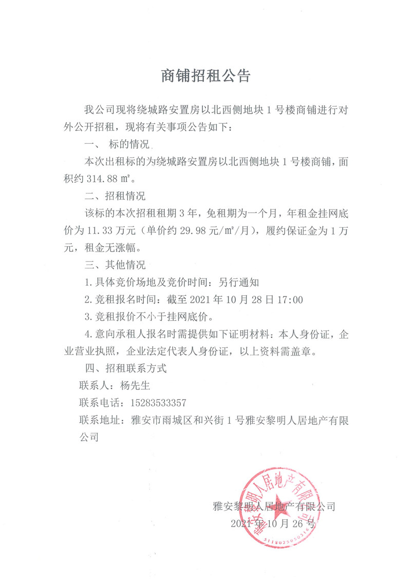 繞城路安置房以北西側(cè)地塊1號(hào)樓商鋪招租公告