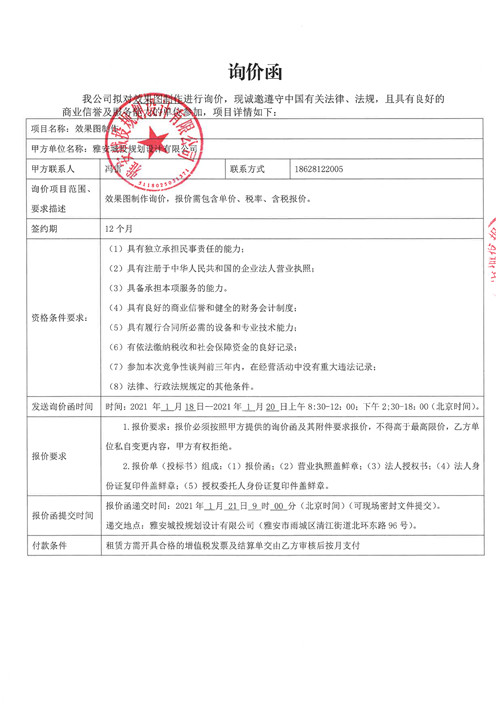 雅安城投規(guī)劃設(shè)計有限公司效果圖制作服務(wù)詢價函