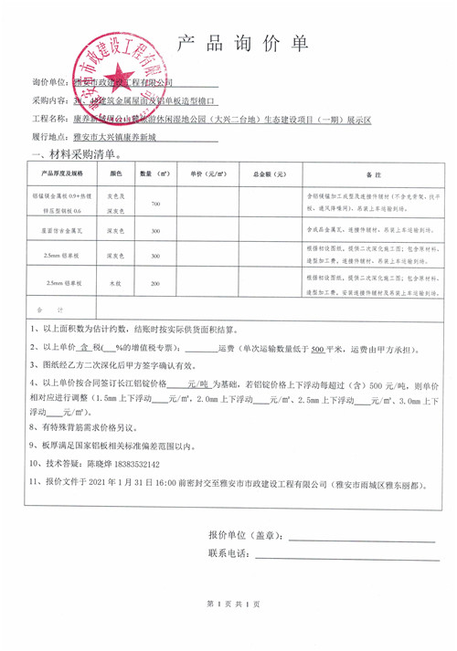 雅安市政建設(shè)工程有限公司康養(yǎng)新城周公山麓旅游休閑濕地公園(大興二臺(tái)地)生態(tài)建設(shè)項(xiàng)目(一期)展示區(qū)3#、4#建筑金屬屋面及鋁單板造型檐口產(chǎn)品詢價(jià)單