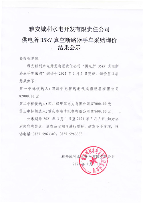 城利水電公司供電所35kV真空斷路器手車采購(gòu)詢價(jià)結(jié)果公示