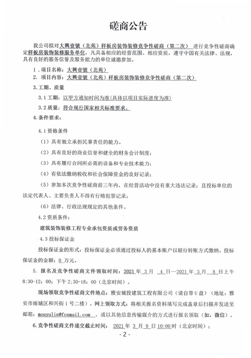 城投建工公司大興壹號(北苑)樣板房裝飾裝修競爭性磋商公告(第二次)