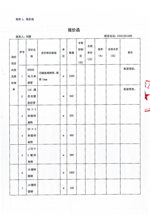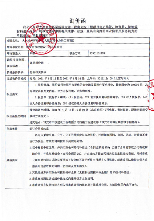 雅安市政公司大興南外環(huán)至新區(qū)大道三段電力溝工程項目電力排管、檢查井、接地等材料詢價函詢價