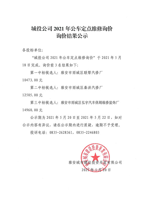 城投公司2021年公車定點(diǎn)維修詢價(jià)詢價(jià)結(jié)果公示