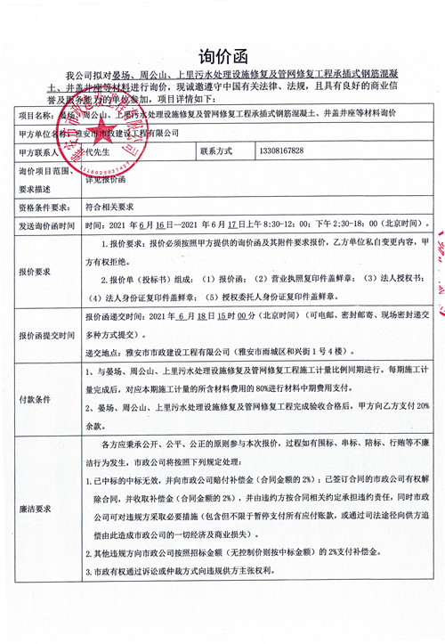 雅安城投市政公司晏場、周公山、上里污水處理設施修復及管網(wǎng)修復工程承插式鋼筋混凝土、井蓋井座等材料詢價函