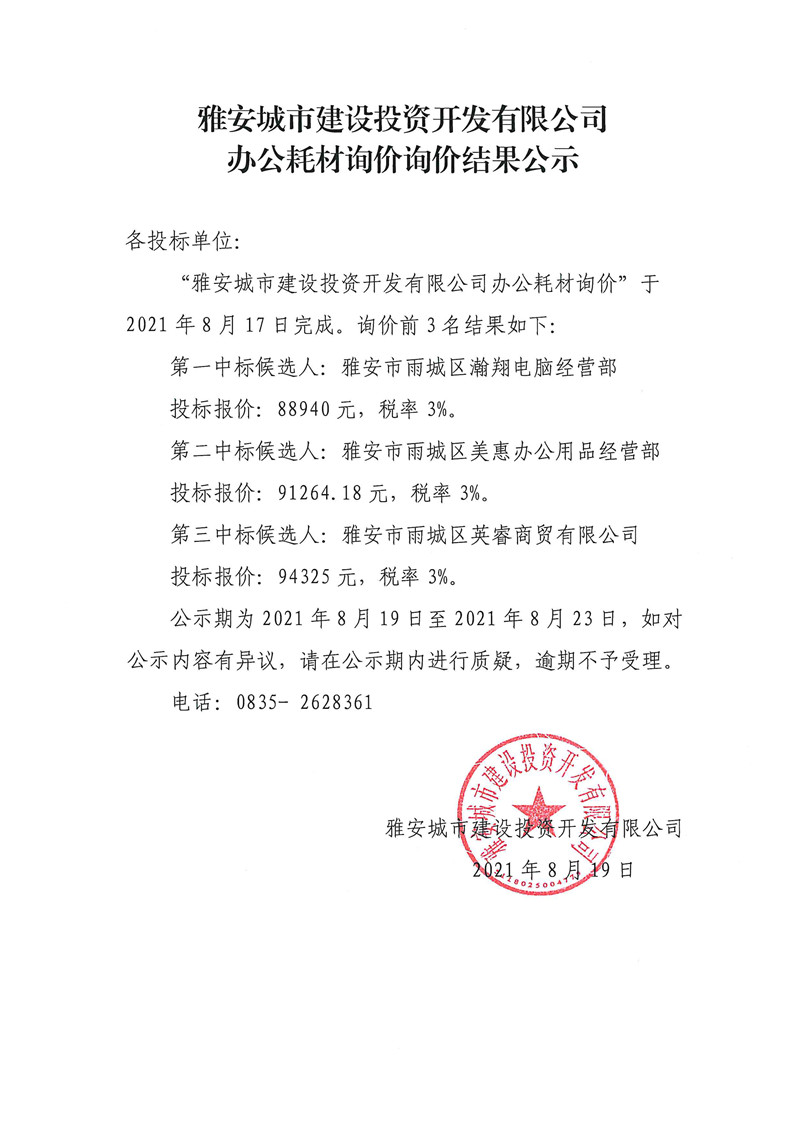 城投公司辦公耗材詢(xún)價(jià)結(jié)果公示
