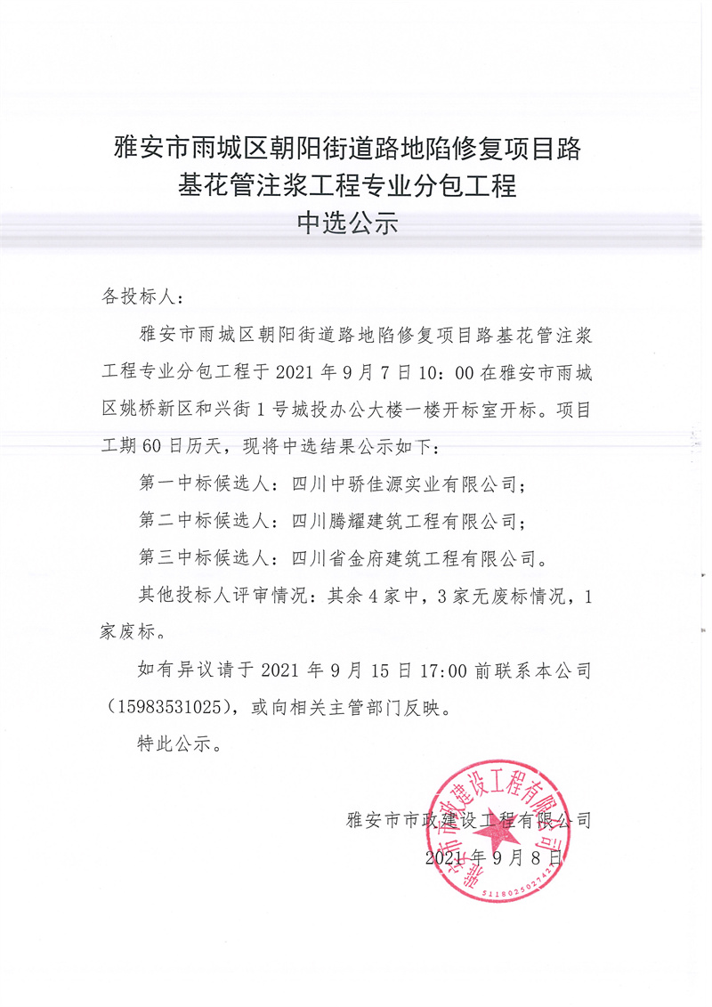 雅安市雨城區(qū)朝陽街道路地陷修復(fù)項(xiàng)目路基花管注漿工程專業(yè)分包工程中選公示