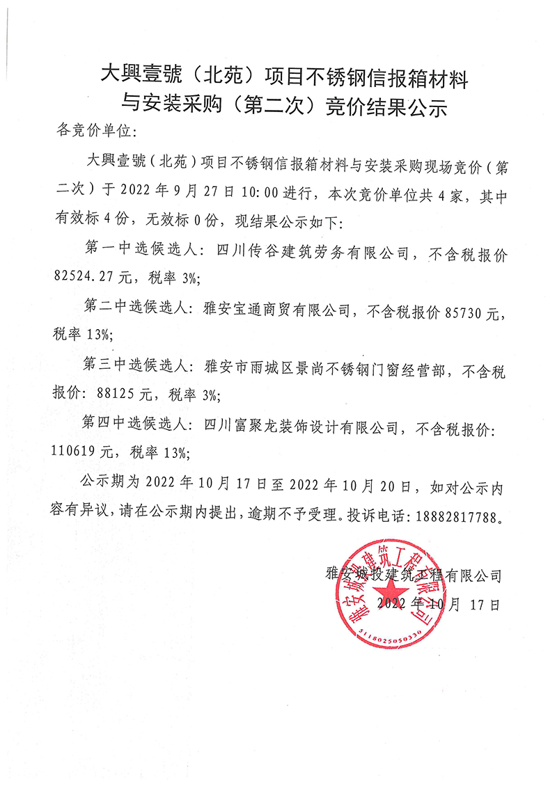 大興壹號(hào)(北苑)項(xiàng)目不銹鋼信報(bào)箱材料與安裝采購(gòu)(第二次)競(jìng)價(jià)結(jié)果公示