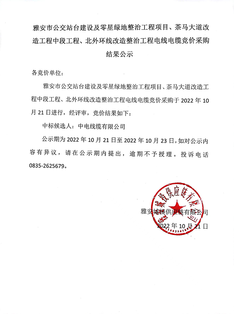 雅安市公交站臺(tái)建設(shè)及零星綠地整治工程項(xiàng)目、茶馬大道改造工程中段工程、北外環(huán)線改造整治工程電線電纜采購競(jìng)價(jià)結(jié)果公告