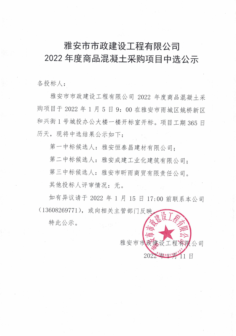 雅安市市政建設(shè)工程有限公司2022年度商品混凝土采購(gòu)項(xiàng)目中選公示