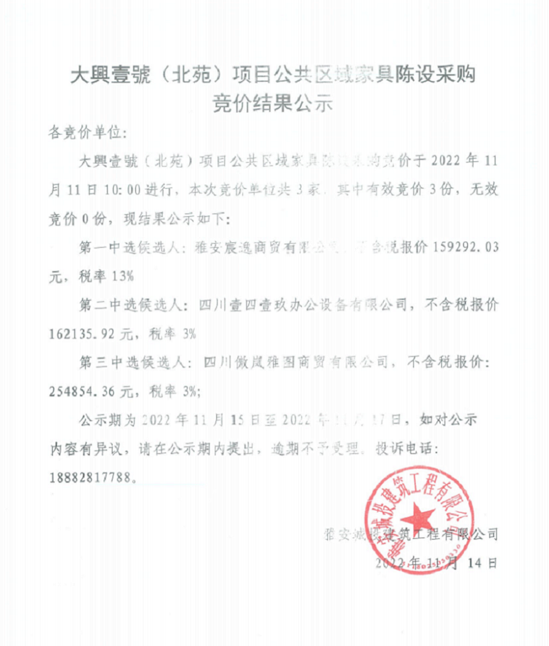 大興壹號(hào)(北苑)項(xiàng)目公共區(qū)域家具陳設(shè)采購(gòu)競(jìng)價(jià)結(jié)果公示