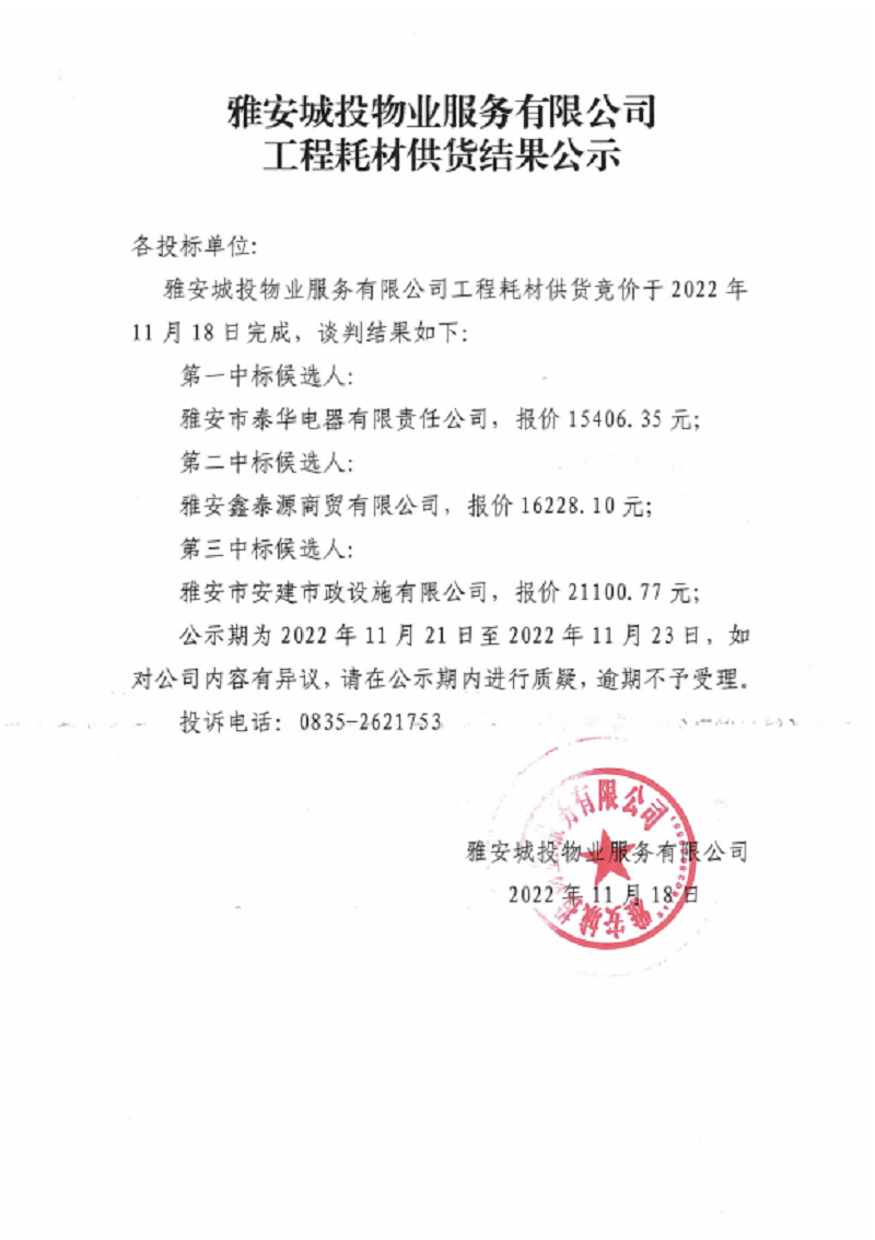 雅安城投物業(yè)服務有限公司工程耗材供貨結果公示
