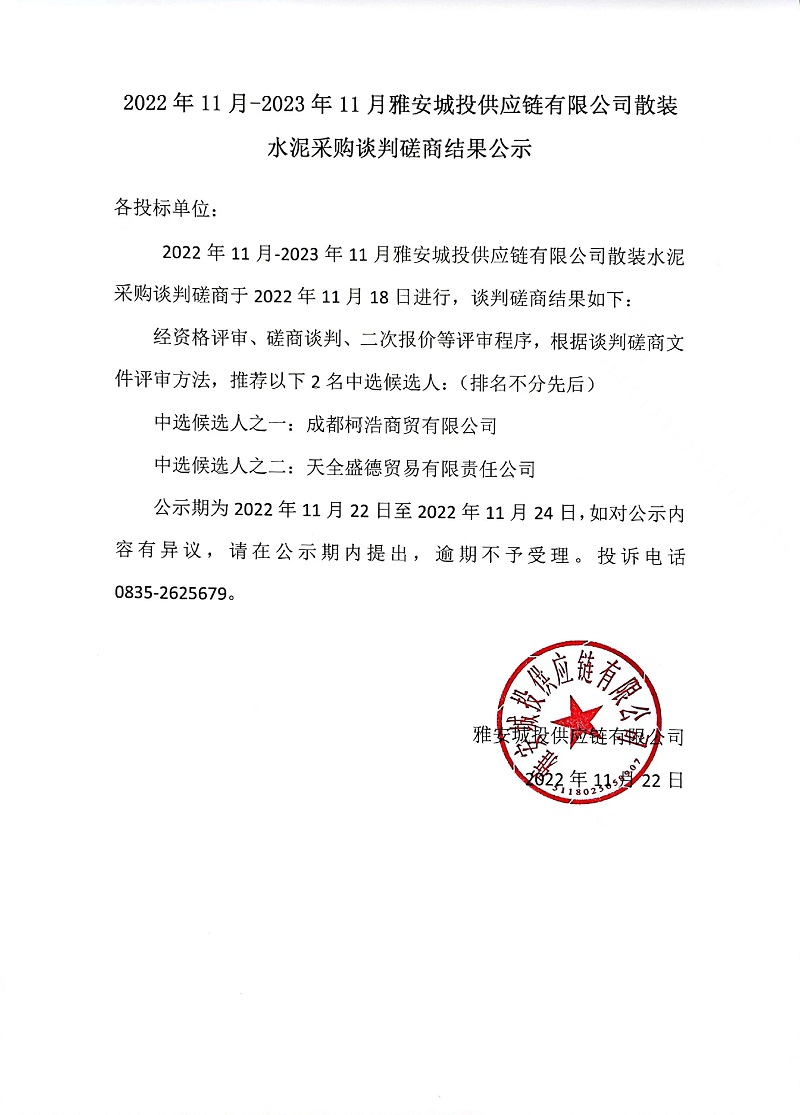 2022年11月-2023年11月雅安城投供應(yīng)鏈有限公司散裝水泥采購(gòu)談判磋商結(jié)果公示