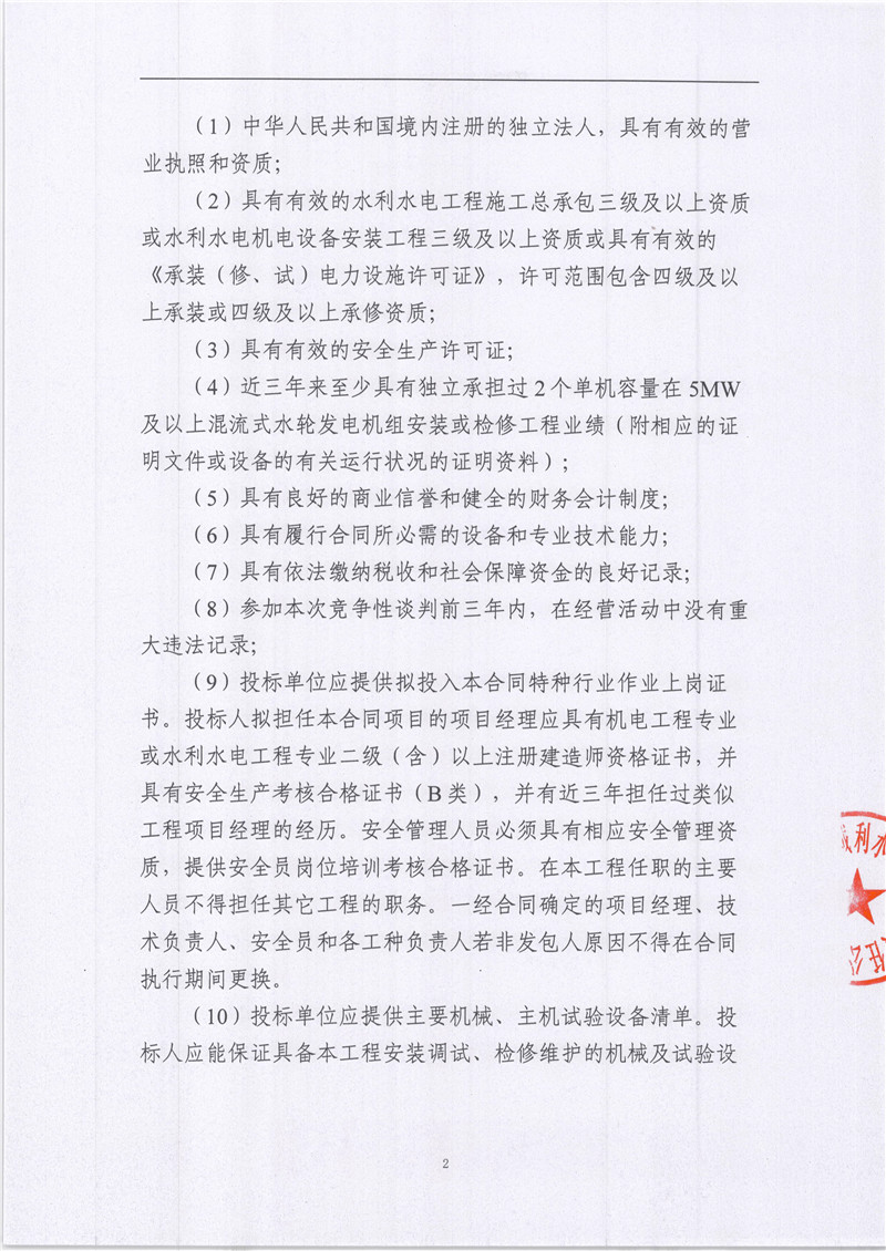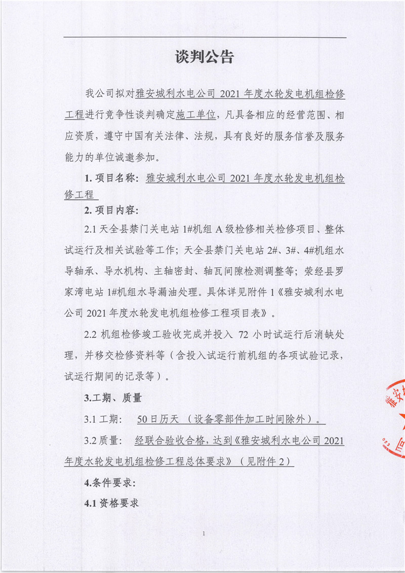 雅安城利水電公司2021年度水輪發(fā)電機(jī)檢修工程競(jìng)爭(zhēng)性談判公告