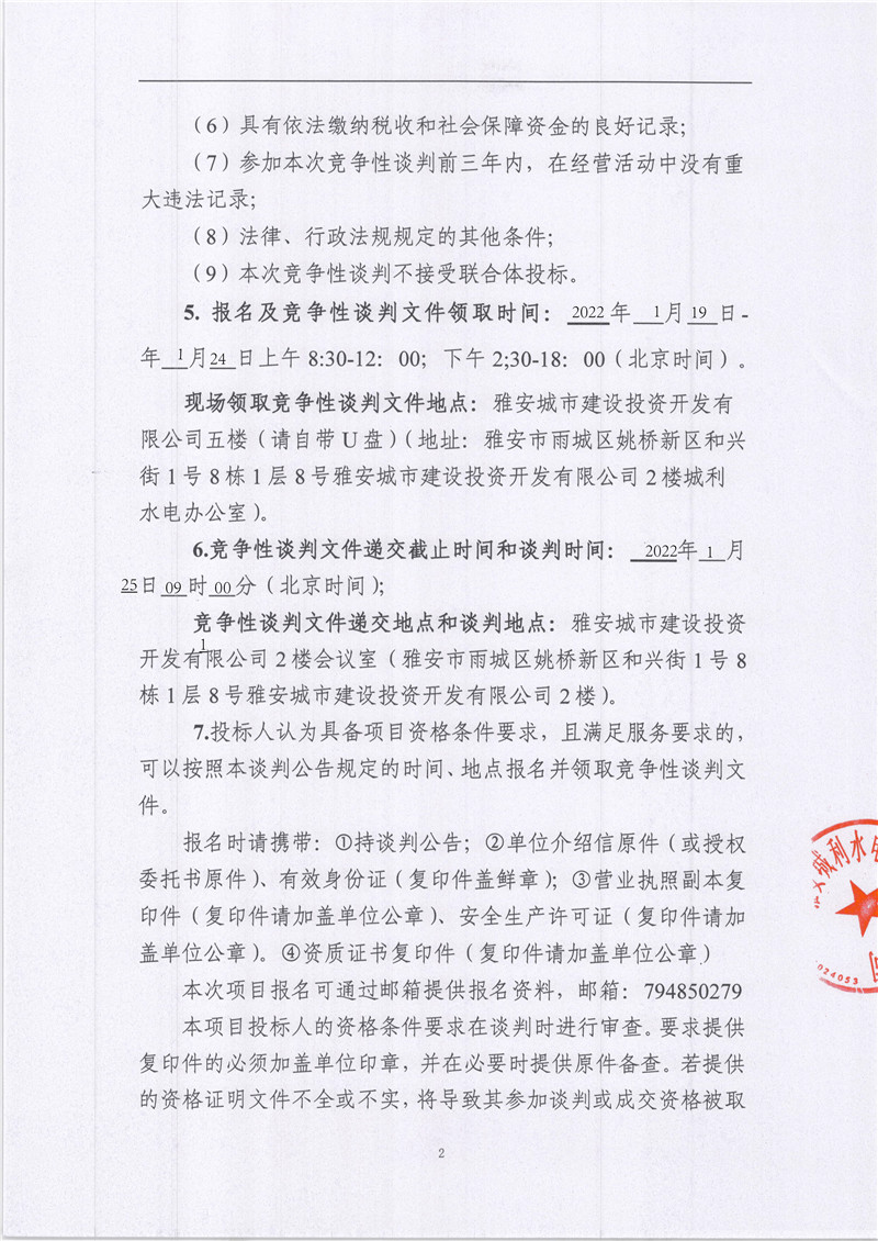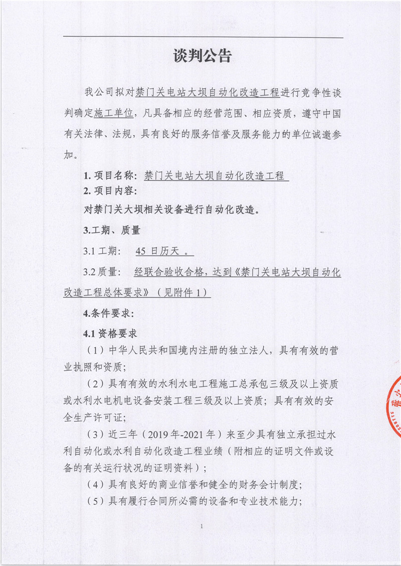雅安城利水電公司禁門關電站大壩自動化改造工程競爭性談判公告