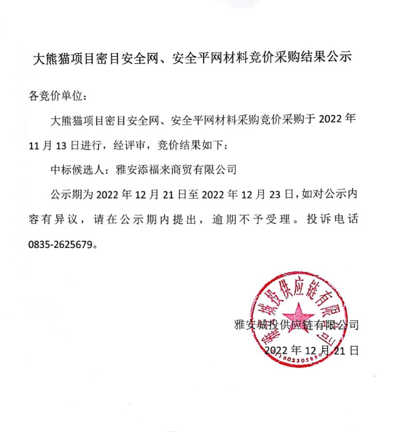 大熊貓項(xiàng)目密目安全網(wǎng)、安全平網(wǎng)材料競(jìng)價(jià)采購結(jié)果公示