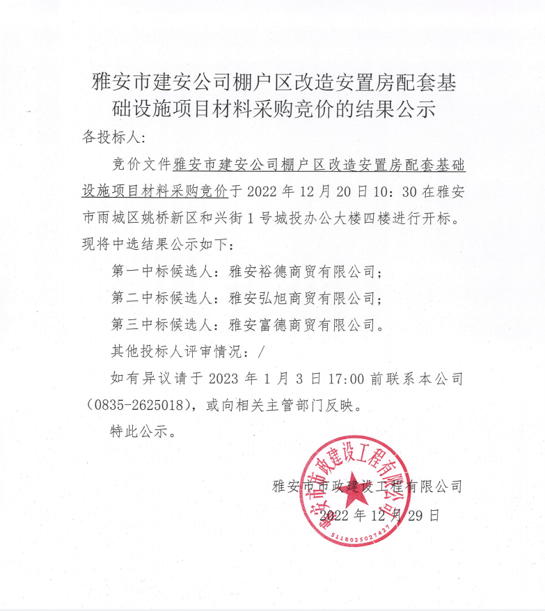 雅安市建安公司棚戶區(qū)改造安置房配套基礎(chǔ)設(shè)施項目材料采購競價結(jié)果公示