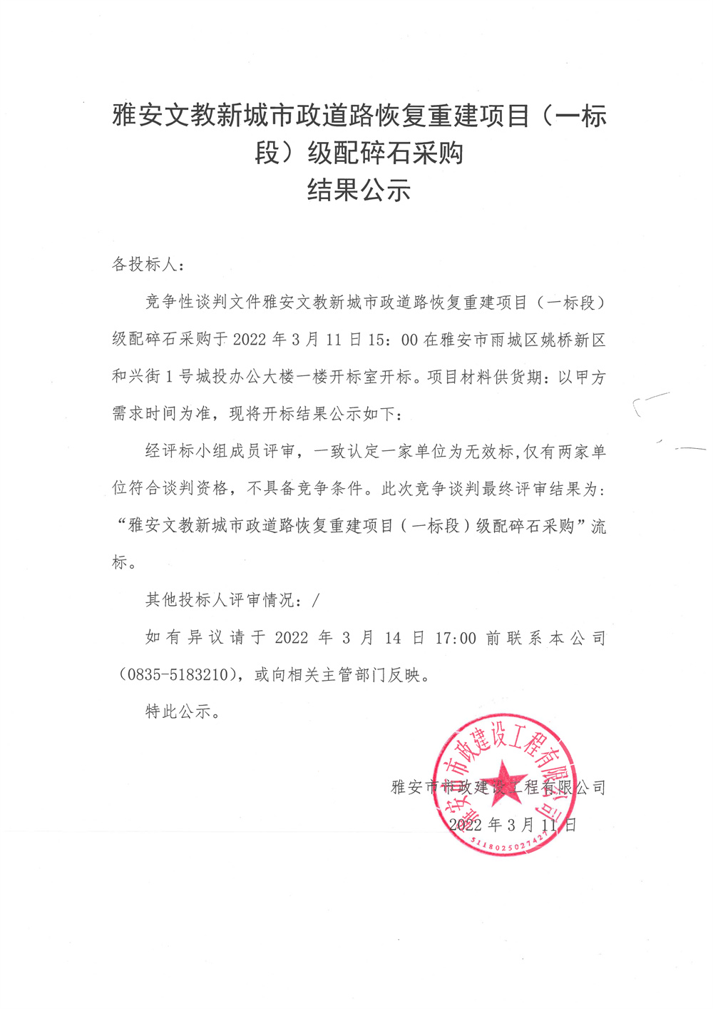雅安文教新城市政道路恢復重建項目(一標段)級配碎石采購結(jié)果公示