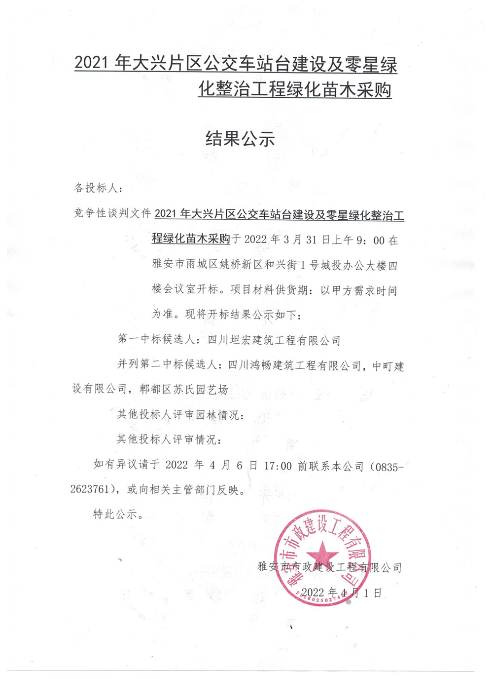 2021年大興片區(qū)公交站臺(tái)建設(shè)及零星綠地整治工程綠化苗木采購結(jié)果公示