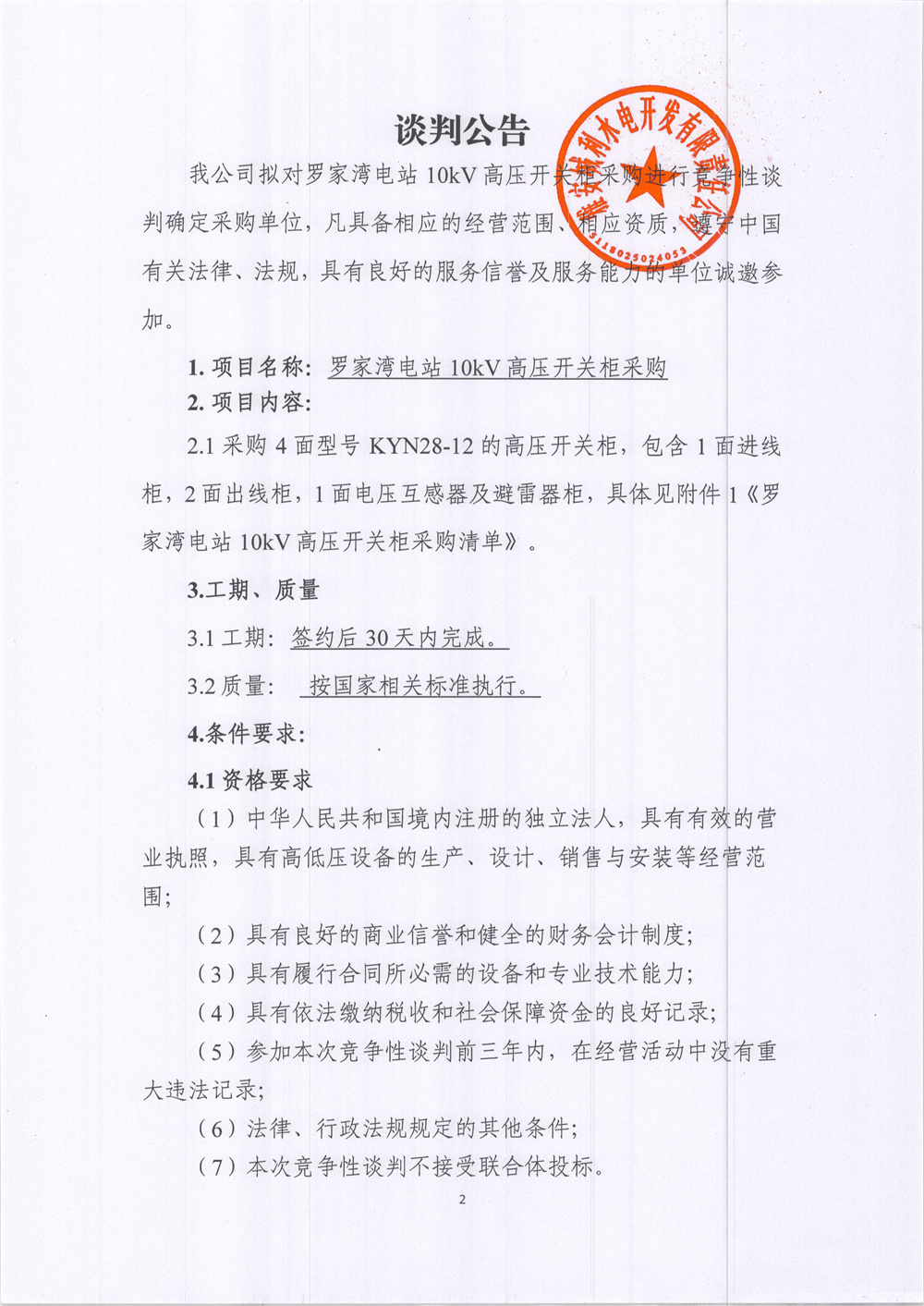 城利水電公司羅家灣電站10KV高壓開關柜柜采購競爭性談判公告
