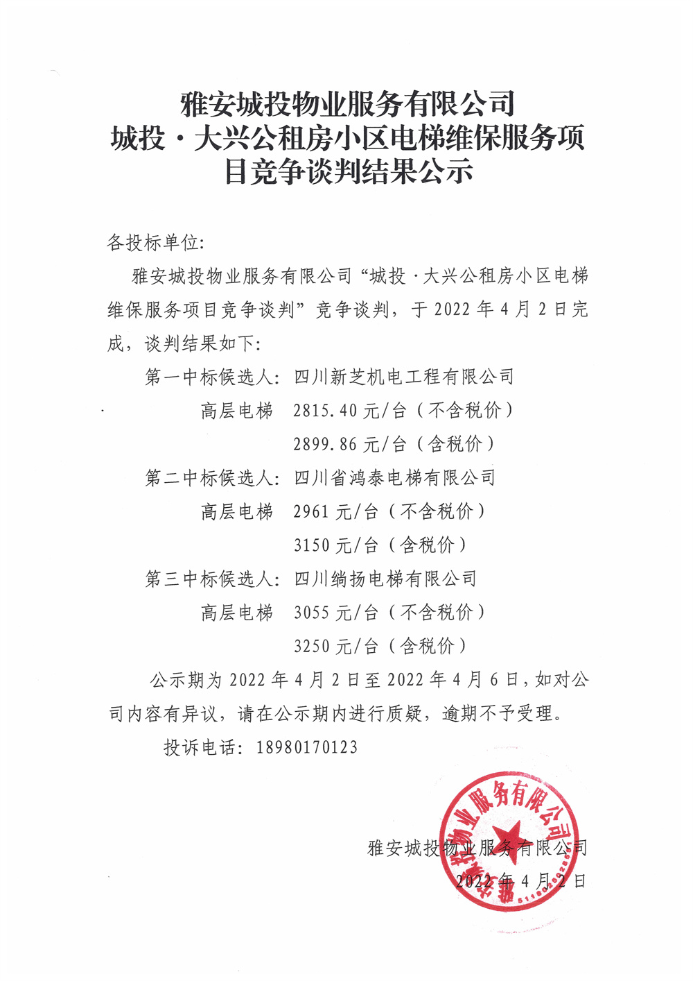 城投·大興公租房小區(qū)電梯維保服務(wù)項(xiàng)目競爭談判結(jié)果公示