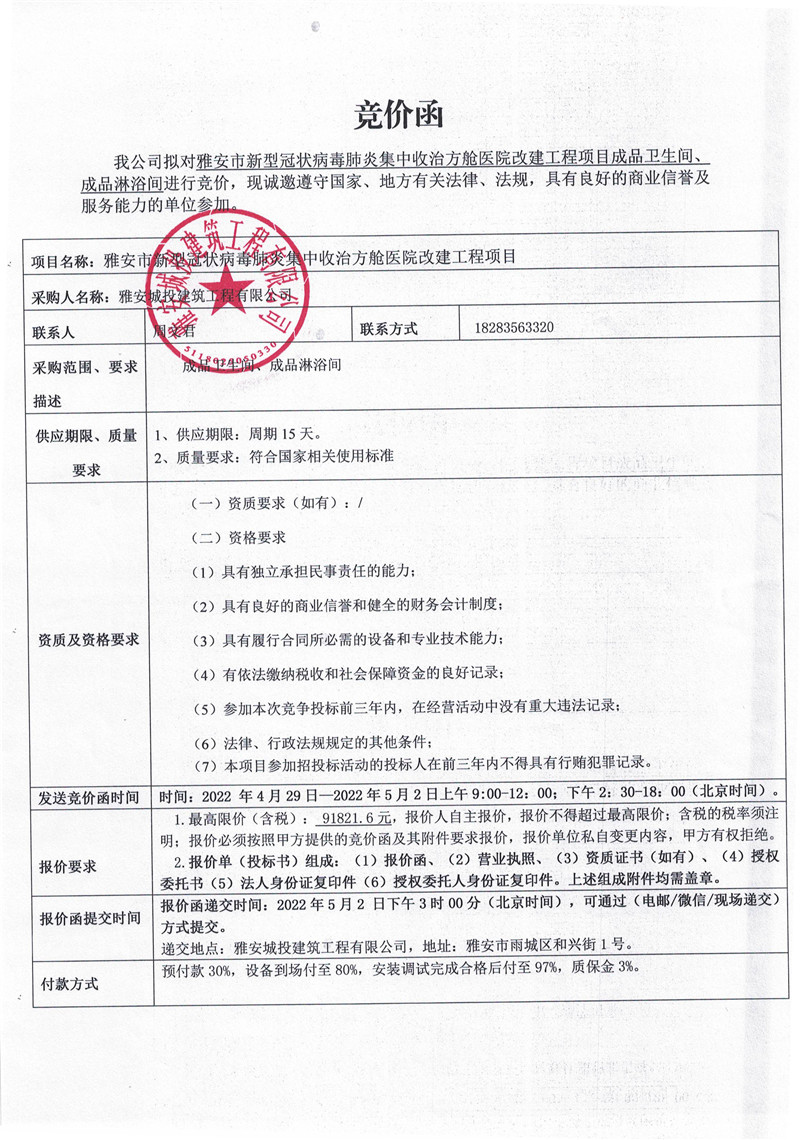 雅安市新型冠狀病毒肺炎集中收治方艙醫(yī)院改建工程項(xiàng)目成品衛(wèi)生間、淋浴間競價(jià)函