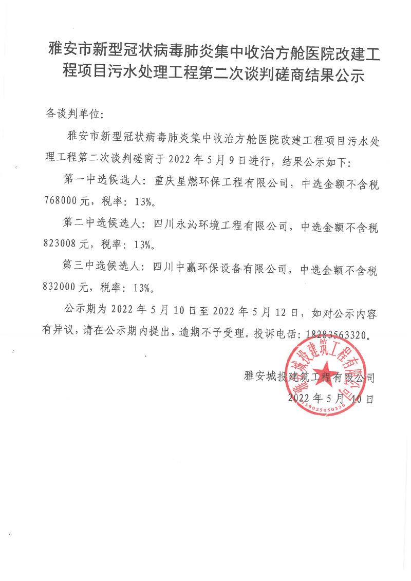 雅安市新型冠狀病毒肺炎集中收治方艙醫(yī)院改建工程項目污水處理工程第二次談判磋商結(jié)果公示