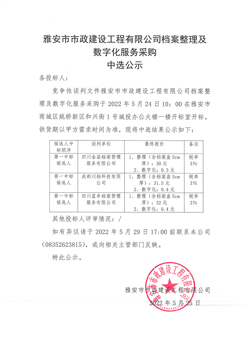 雅安市市政建設(shè)工程有限公司檔案整理及數(shù)字化服務(wù)采購中選公示