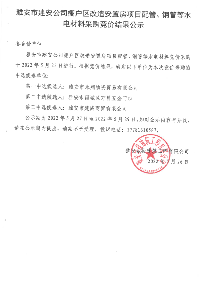 雅安市建安公司棚戶區(qū)改造安置房項目配管、鋼管等水電材料采購競價結(jié)果公示