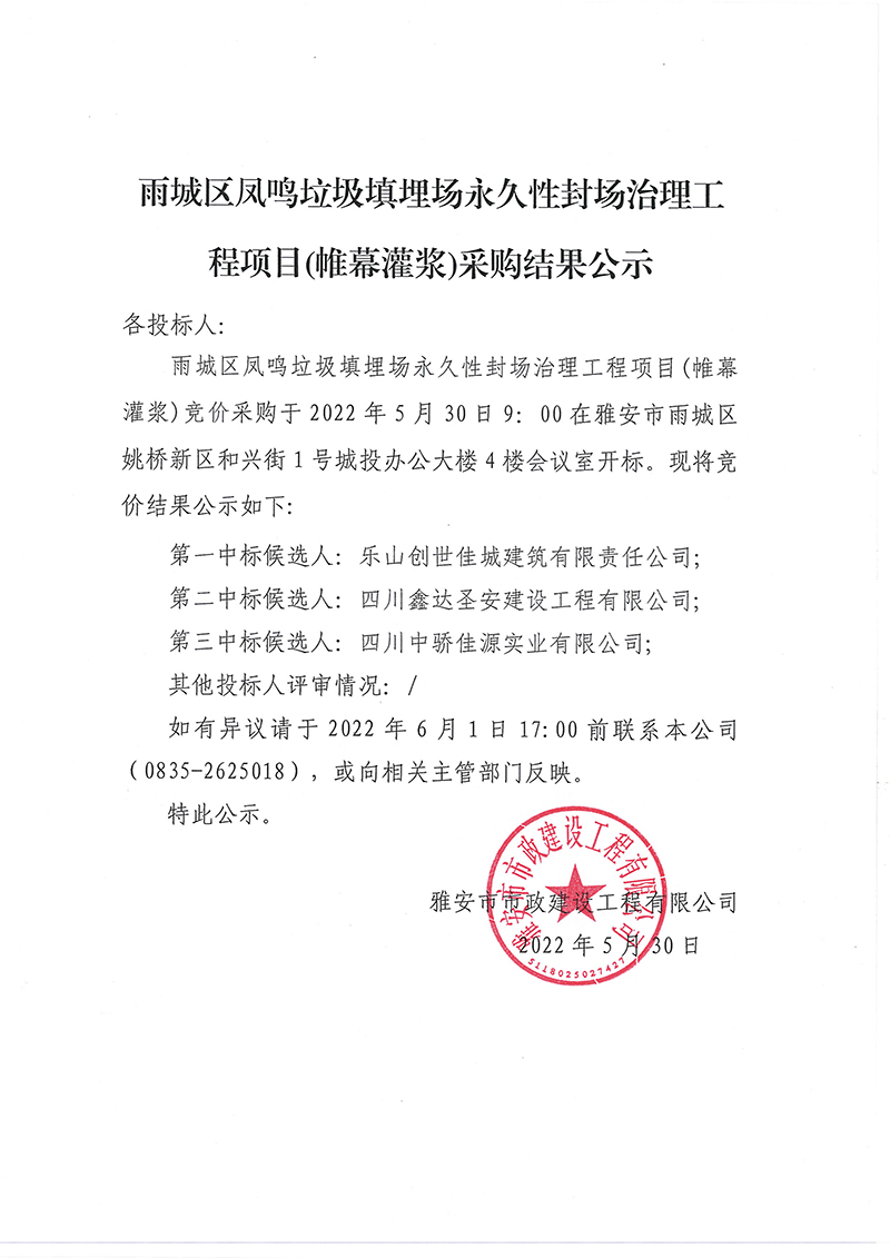 雨城區(qū)鳳鳴垃圾填埋場(chǎng)永久性封場(chǎng)治理工程項(xiàng)目(帷幕灌漿)采購(gòu)結(jié)果公示
