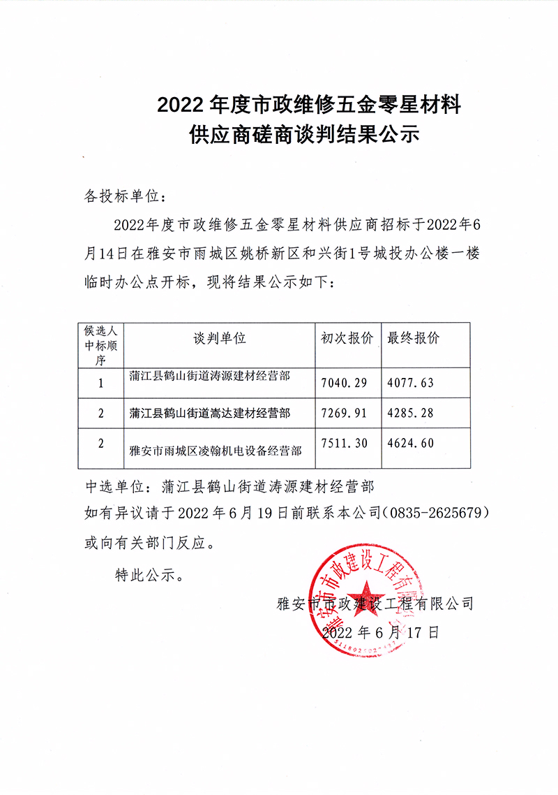 2022年度市政維修五金零星材料供應(yīng)商談判磋商談判結(jié)果公示