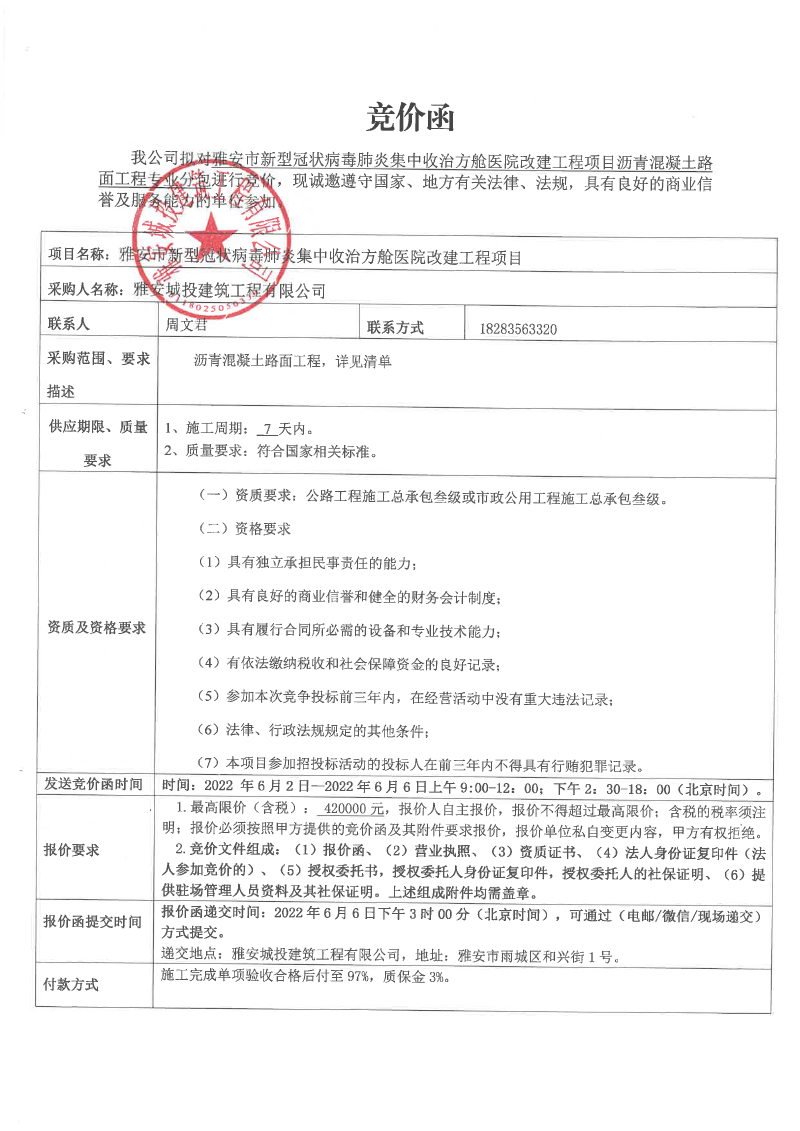 雅安市新型冠狀病毒肺炎集中收治方艙醫(yī)院改建工程項(xiàng)目瀝青混凝土路面工程專業(yè)分包競(jìng)價(jià)函