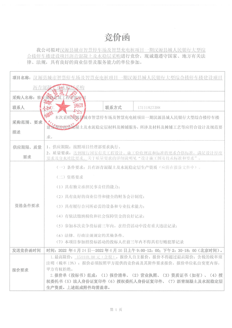 漢源縣城市智慧停車場(chǎng)及智慧充電樁項(xiàng)目一期漢源縣城人民銀行大型綜合樓停車樓建設(shè)項(xiàng)目瀝青混凝土、水穩(wěn)層采購競(jìng)價(jià)公告