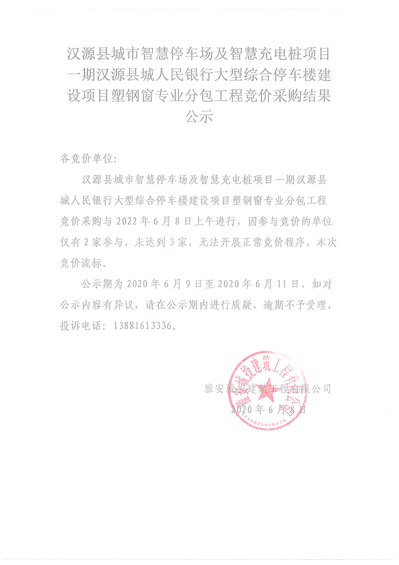 漢源縣城市智慧停車場及智慧充電樁項目一期漢源縣城人民銀行大型綜合樓停車樓建設項目塑鋼窗專業(yè)分包工程競價采購結果公示