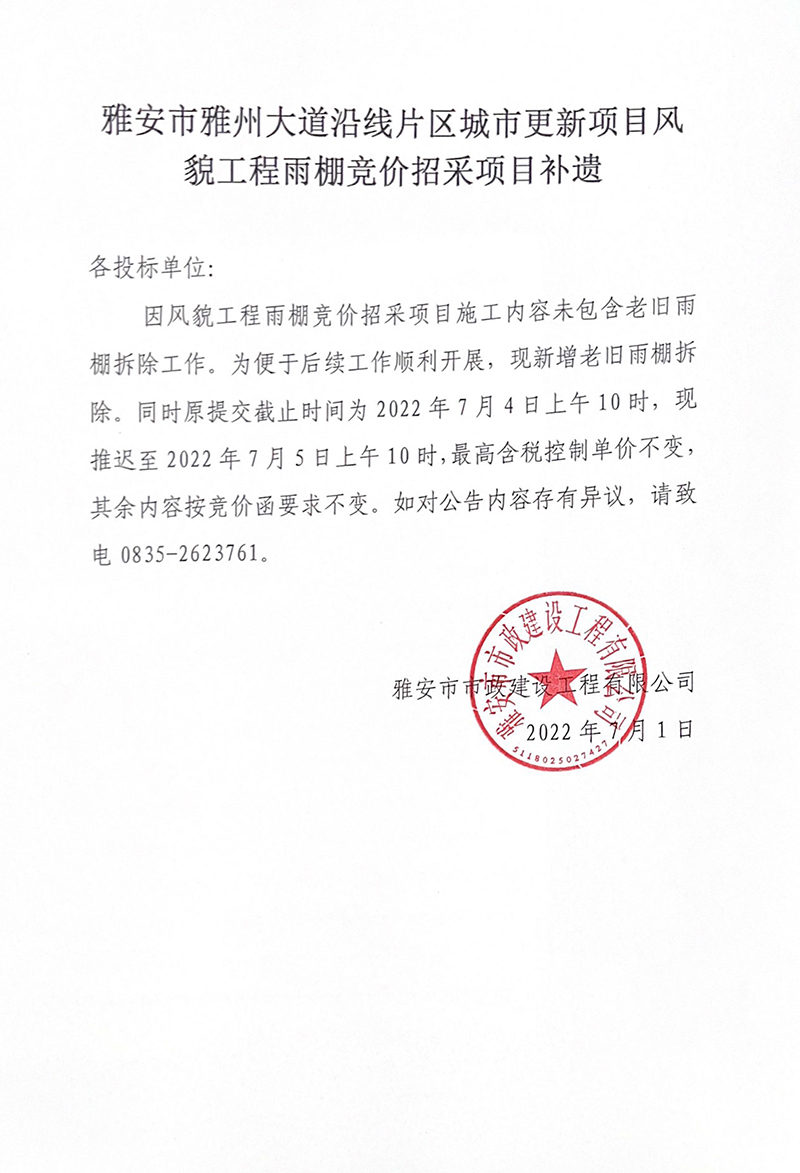 雅安市雅州大道沿線片區(qū)城市更新項目風(fēng)貌工程雨棚競價招采項目補遺