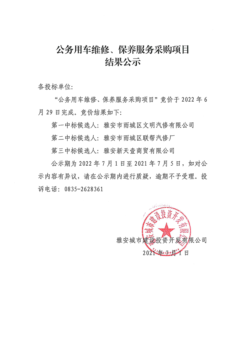 雅安城市建設投資開發(fā)有限公司 公務用車維修、保養(yǎng)服務采購項目結果公示