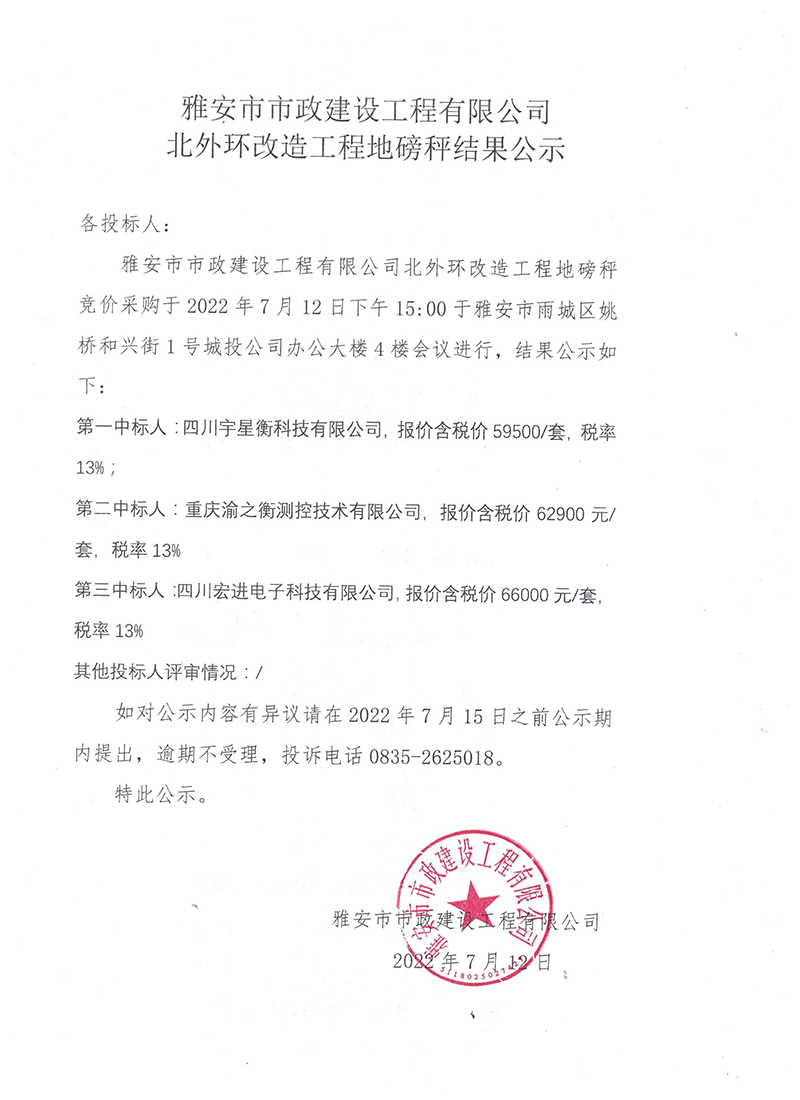 雅安市北外環(huán)改造工程地磅秤詢價(jià)結(jié)果公示