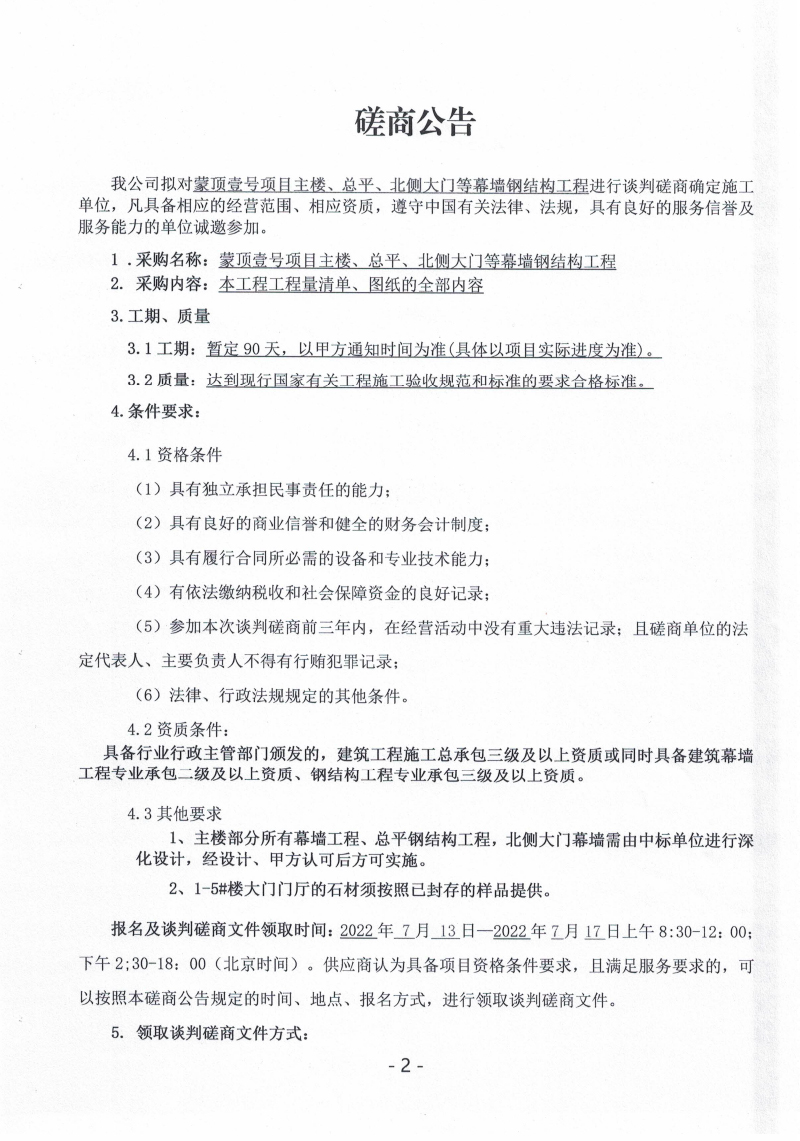 蒙頂壹號項目主樓、總坪、北側(cè)大門幕墻鋼結(jié)構(gòu)工程談判磋商公告