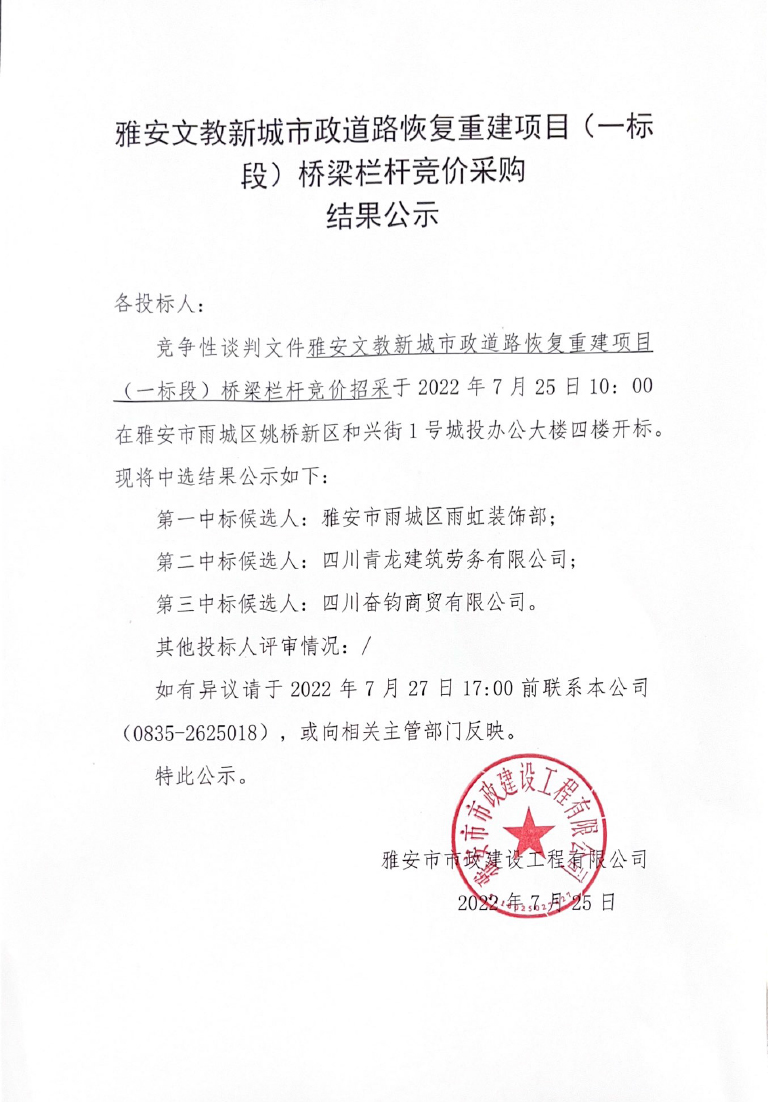 雅安文教新城市政道路恢復(fù) 重建項(xiàng)目競(jìng)價(jià)(一標(biāo)段)橋梁欄桿競(jìng)價(jià)采購(gòu)結(jié)果公示