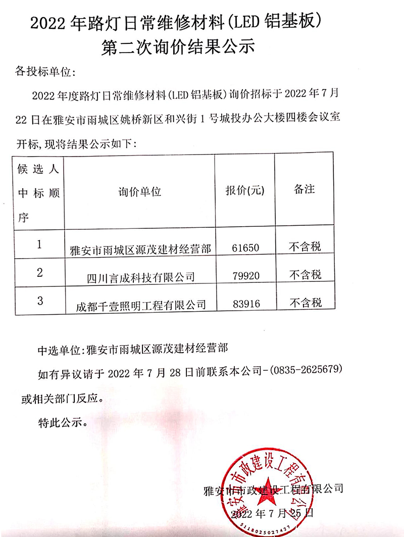 2022年路燈日常維修材料(LED鋁基板)第二次詢價結(jié)果公示
