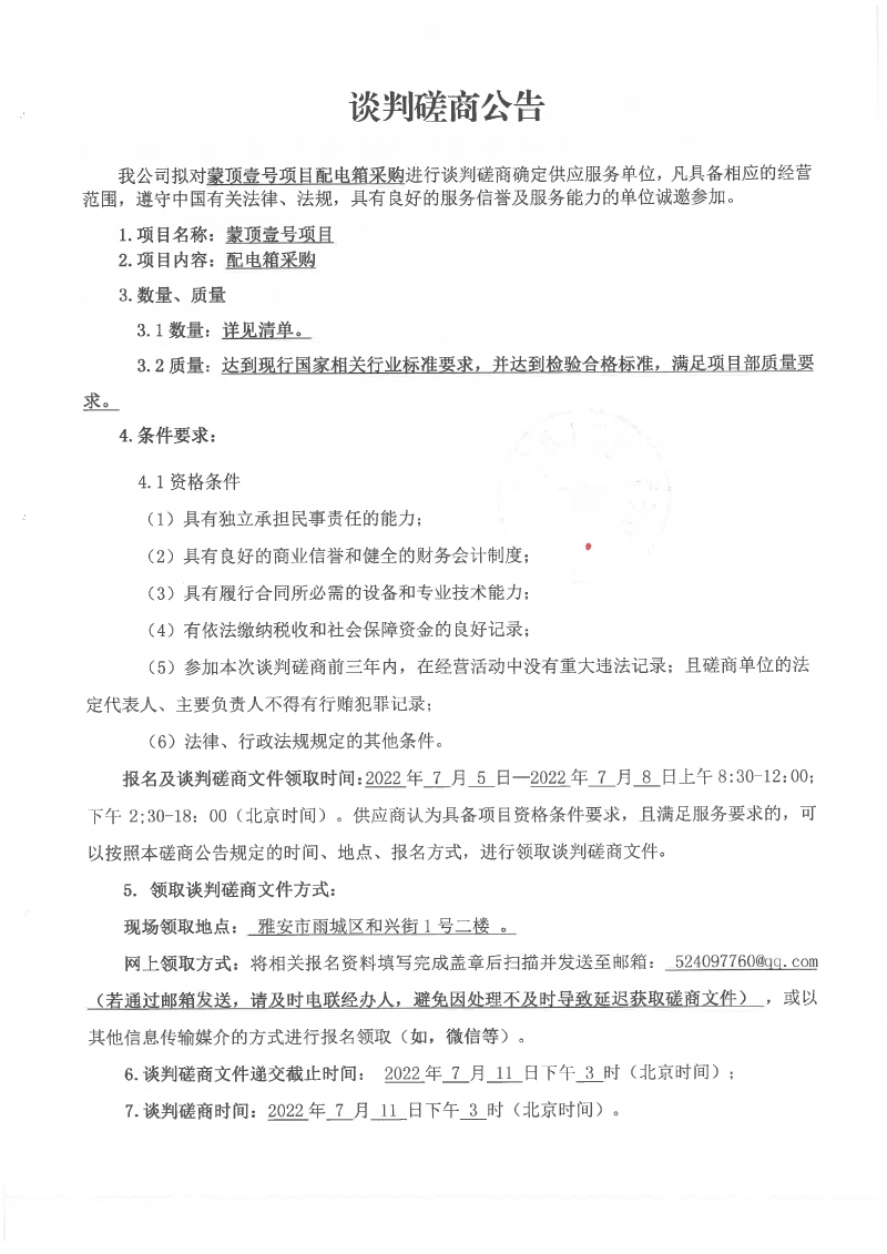 蒙頂壹號項目配電箱采購談判磋商公告