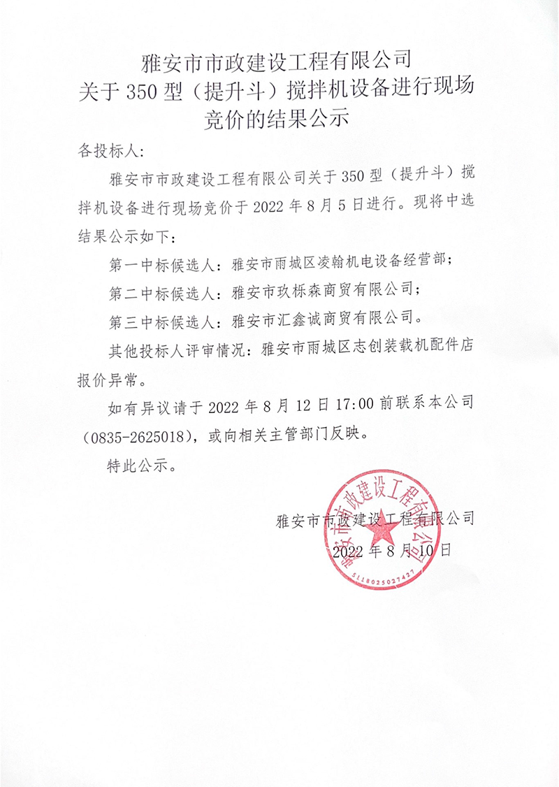 關(guān)于350型(提升斗)攪拌機(jī)設(shè)備進(jìn)行現(xiàn)場(chǎng)競(jìng)價(jià)的結(jié)果公示