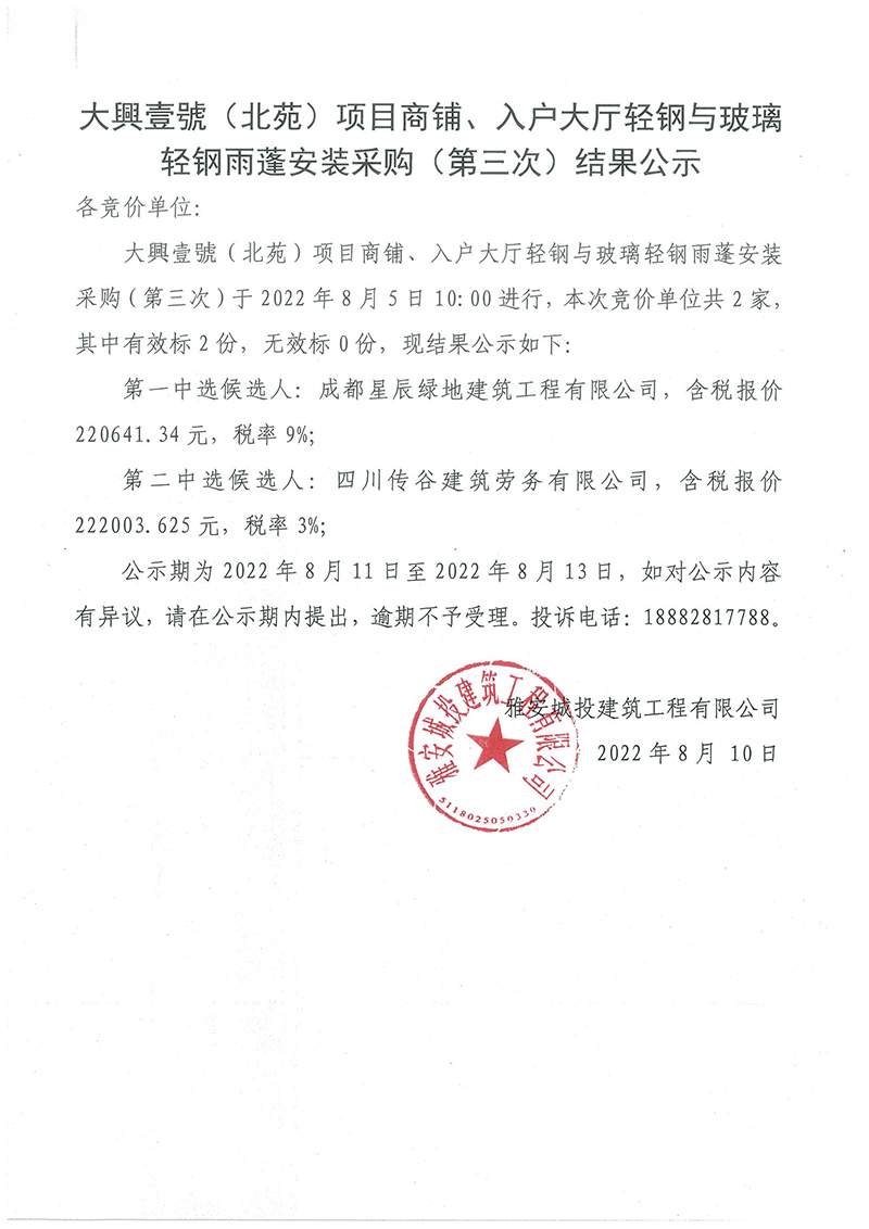 大興壹號(北苑)項目商鋪、入戶大廳輕鋼與玻璃輕鋼雨蓬安裝采購(第三次)結(jié)果公示
