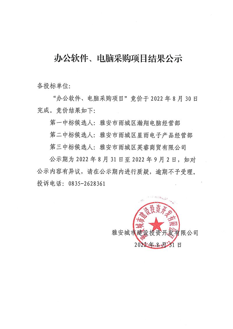 雅安城市建設(shè)投資開發(fā)有限公司辦公軟件、電腦采購(gòu)項(xiàng)目結(jié)果公示