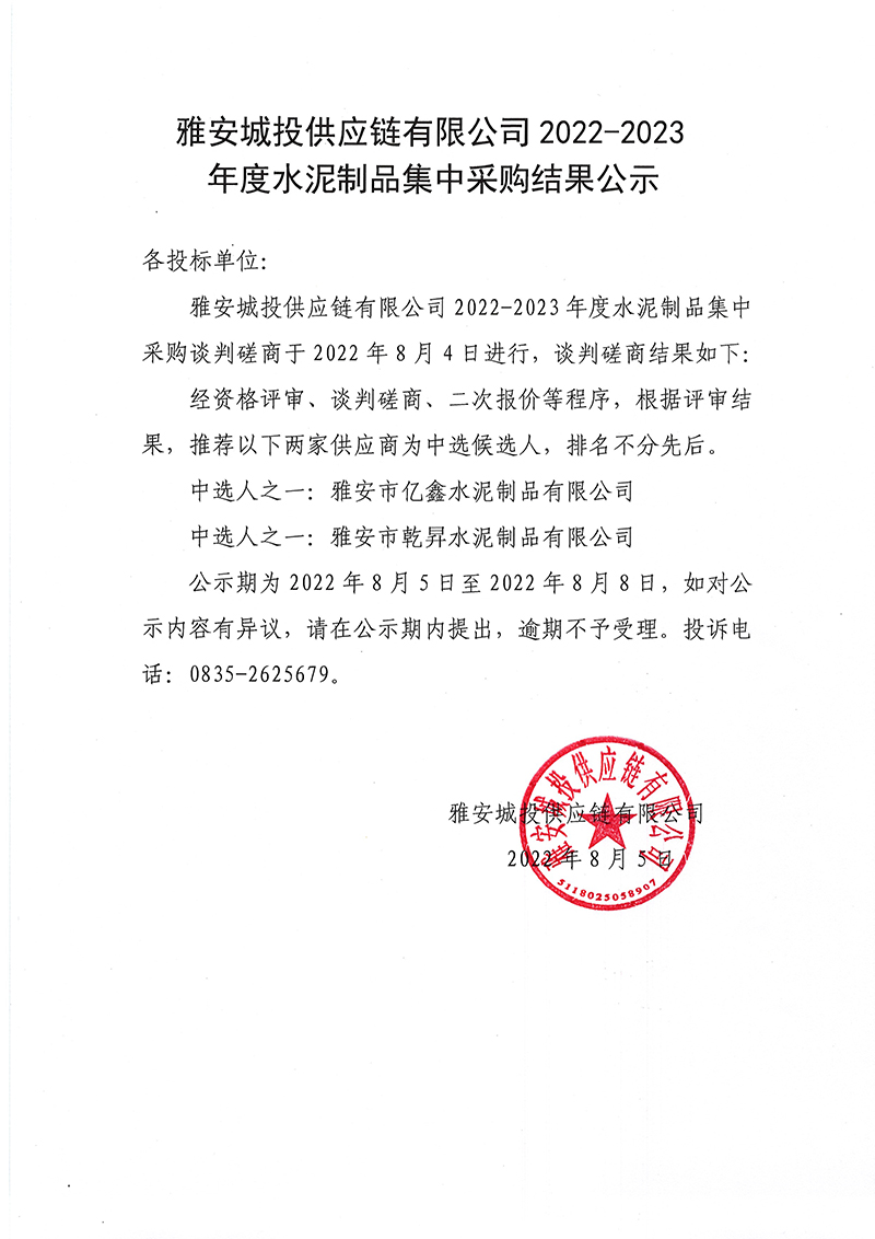 雅安城投供應(yīng)鏈有限公司2022-2023年度水泥制品集中采購結(jié)果公示