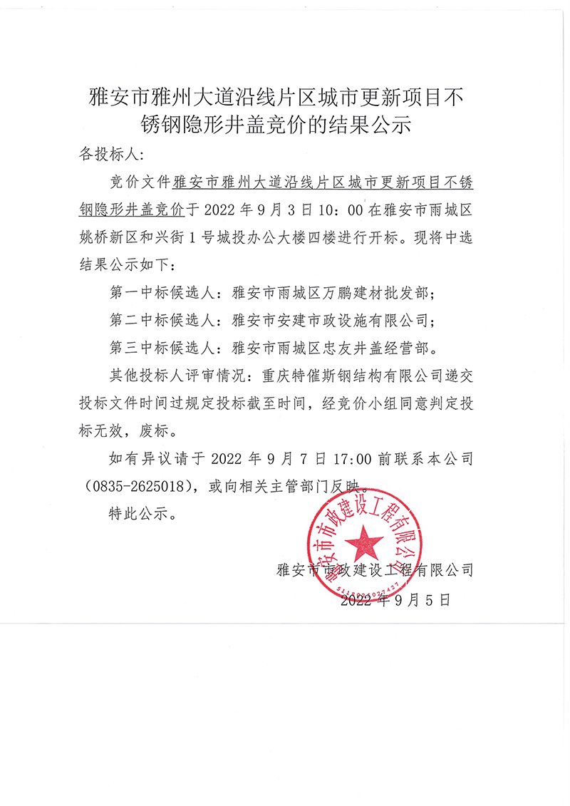 雅安市雅州大道沿線片區(qū)城市更新項目不銹鋼隱形井蓋競價招采競價的結果公示