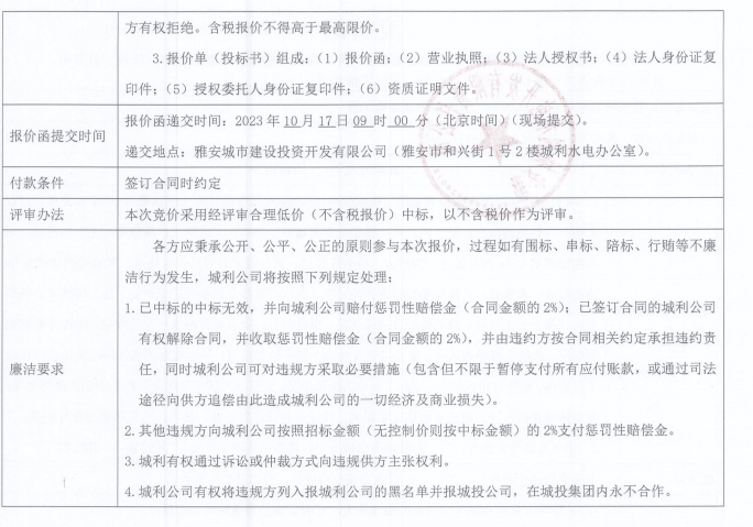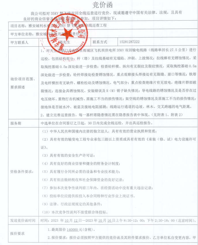 雅安城利水電公司35KV禁飛線雙回全線巡查工程競價(jià)公告