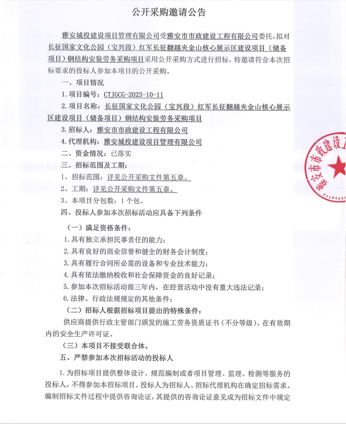 長(zhǎng)征國(guó)家文化公園(寶興段)紅軍長(zhǎng)征翻越夾金山核心展示區(qū)建設(shè)項(xiàng)目(儲(chǔ)備項(xiàng)目)鋼結(jié)構(gòu)安裝勞務(wù)采購(gòu)項(xiàng)目公開(kāi)采購(gòu)邀請(qǐng)公告
